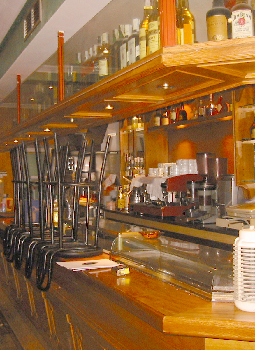 La barra se transformó al revestirse de gresite negro y se sustituyó la tapa por una madera maciza. Para darle un carácter distintivo, se crearon hornacinas con metacrilatos de colores y manchas de vinilo negro, generando la ilusión de un entelado.