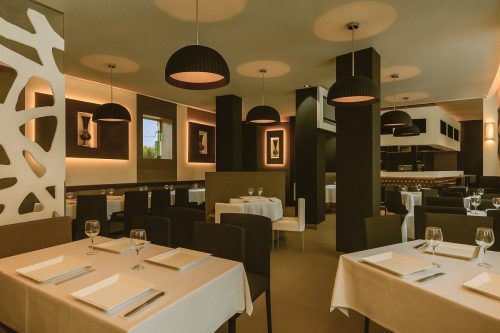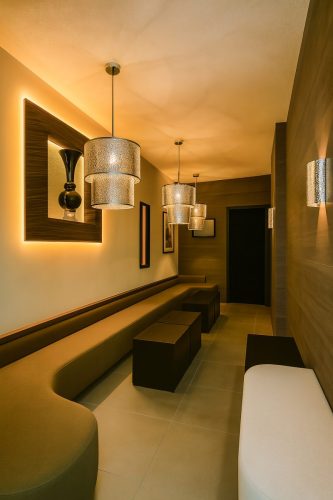 El diseño busca una imagen limpia, sinuosa y diferenciadora, con especial atención a la iluminación LED RGB para generar efectos de luz y color. La decoración se basa en materiales nobles y acabados actuales, como bancos corridos en polipiel marrón y negro, mesas en wengué con base de acero y chaise longues en zona privada. El resultado es un espacio multidisciplinar, ordenado y lleno de carácter, que responde a las exigencias del mercado actual con elegancia y personalidad.