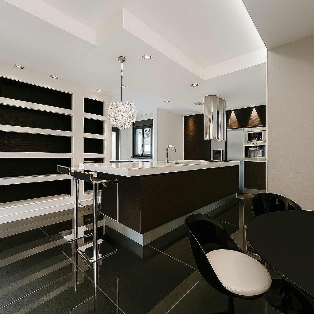 Interiorismo: Se elaboró un diseño interior que abarcara todos los espacios de la vivienda, incluyendo salas de estar, cocina, dormitorios y baños, con especial atención a la iluminación y distribución del espacio.