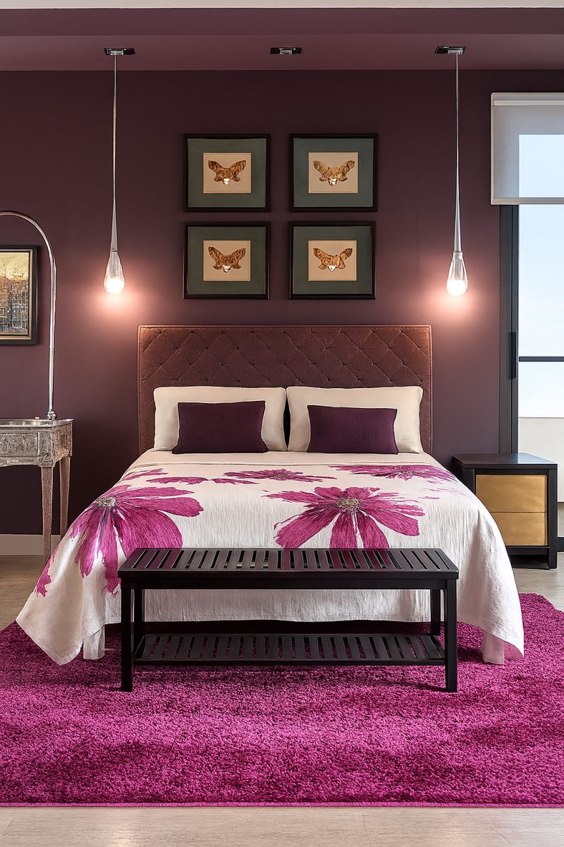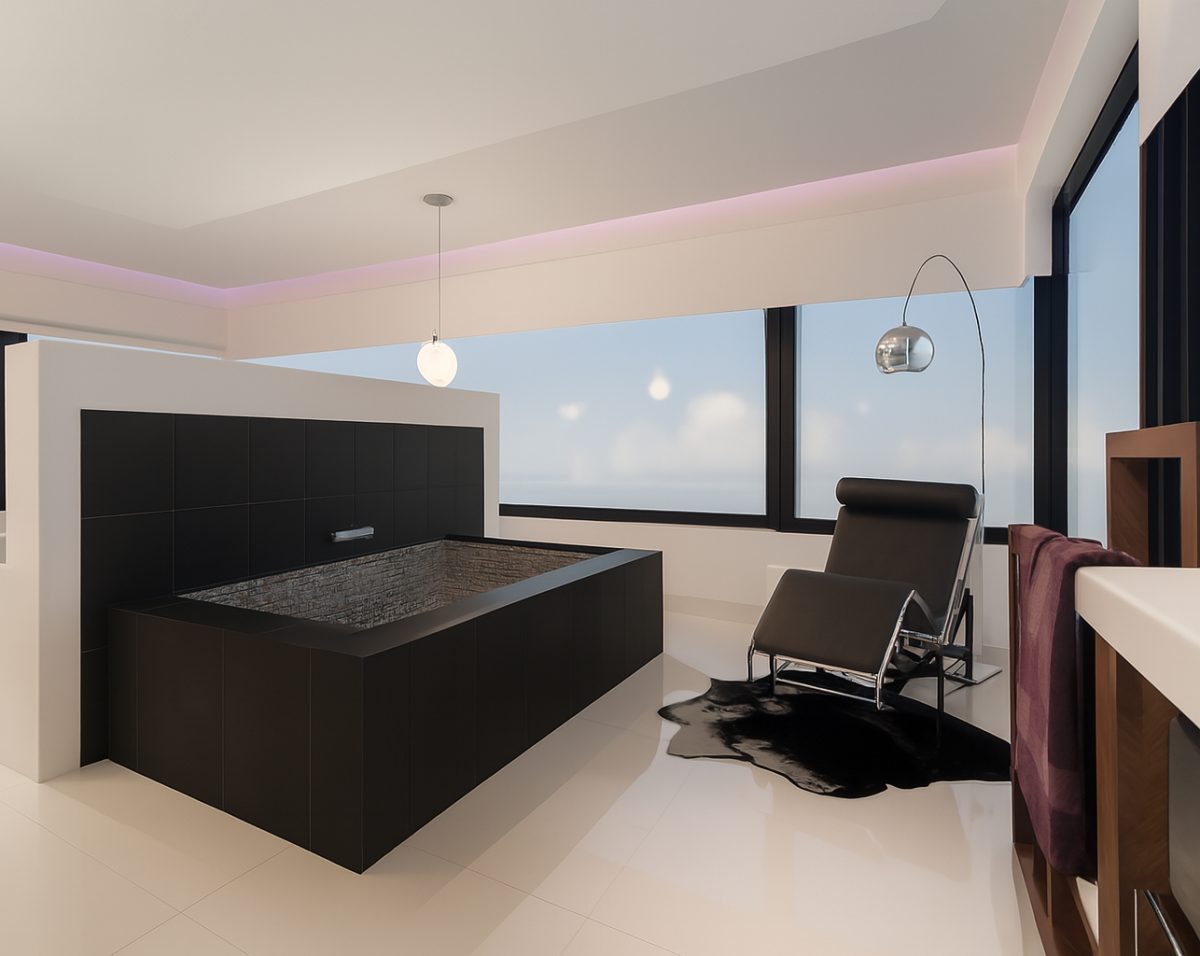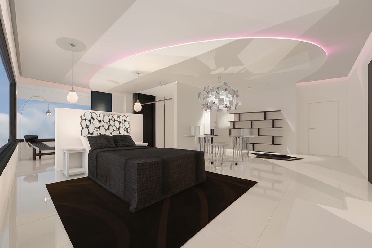 Dormitorio Principal: La entrada al dormitorio principal tiene un diseño elegante y minimalista, con una paleta de colores blancos y negros, y una alfombra de piel de vaca en blanco y negro. La vista del dormitorio principal muestra un espacio moderno y estilizado, con una cama grande, un techo con diseño curvado e iluminación rosa de acento, y una zona de lavabos y ducha integrada.