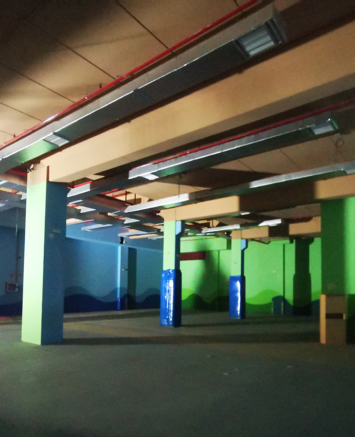 - Zona Diáfana: Dentro, se dispone de una amplia zona diáfana con caja, taquillas y una zona para tomar un tentempié antes de adentrarse en la zona de ocio. El solado está formado por grandes planos de diferentes colores, separados por un led en movimiento que recorre las paredes, pasa por el suelo y se lanza al infinito.
